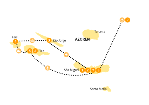 Ein Rundfahrt auf Pico zeigt Ihnen die Schönheiten der INsel, der jüngsten des Azoren-Archipels. Entstanden durch einen unterseeischen Vulkanausbruch zeigt sie einzigartige geologische Formationen, welche eine vielfältige Bodenbeschaffenheit sowie sehr einzigartige Lavaformen aufweisen. Sie besuchen die traditionellen Weinberge, die weltweit einzigartig sind und von der UNESCO als Weltkulturerbe eingestuft wurden und unternehmen vielleicht eine leichte Wanderung entlang eines Lavafeldes unternehmen, um die verschiedenen Formen von Lava zu entdecken (Dauer ca. 2 Stunden - 7 km). Anschließend startet der Flieger zurück nach São Miguel.