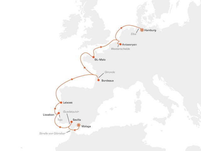 Auf dem Weg von Andalusiens Stadt Malaga nach Hamburg gelangen Sie mit der MS Europa auf malerischen Flusswegen, die nur kleineren Schiffen zugänglich sind, zu den spannenden Städten wie Sevilla, Lissabon, Porto und Bordeaux.